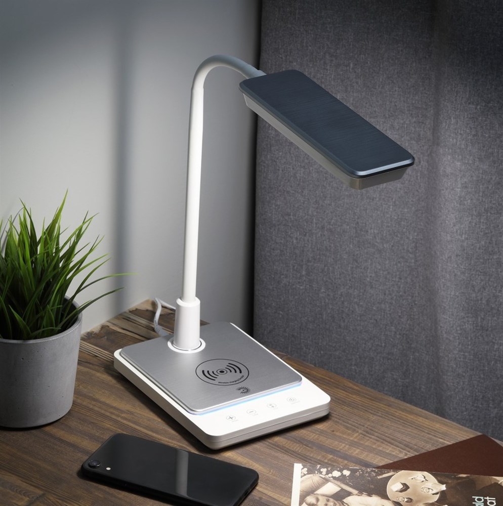 Настольный светильник ЭРА NLED-499-10W-W со светодиодами (LED) в качестве источников света. Оснащен сенсорным управлением с возможностью выбора цветовой температуры (теплый, нейтральный или холодный свет). Плавный диммер для регулировки яркости. Светильник сохраняет выбранные настройки при включении-выключении. Направление света регулируется наклоном и поворотом плафона в любом направлении. Светильник имеет встроенный модуль Qi для беспроводной зарядки мобильных устройств. Просто положите телефон, поддерживающий функцию Qi, на основание светильника в отмеченной зоне - светильник подзарядит его удобно и быстро.