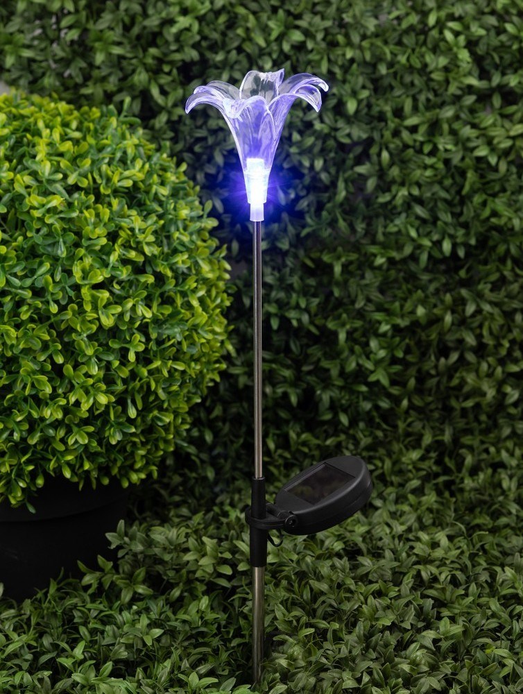 Садовый светильник ЭРА ERASF22-19 (арт. Б0053379) отличает элегантный дизайн в виде прозрачной лилии с разноцветным RGB-светом. Высота уличного светильника - 75 см. Диаметр цветка - 10 см. Солнечная батарея, закреплённая на стойке светильника, накапливает энергию для 8 часов свечения в тёмное время суток. Уличный садовый светильник может применяться в любую погоду, так как отлично защищён от влаги и пыли - IP44. Светодиодная лилия - идеальное дополнение палисадника, клумбы. Яркий разноцветный RGB-светильник уличный в виде цветка хорошо смотрится у фасада дома, у садового пруда, у забора. Особого эффекта можно достичь, купив несколько штук и разместив такие садовые светильники в составе группы.