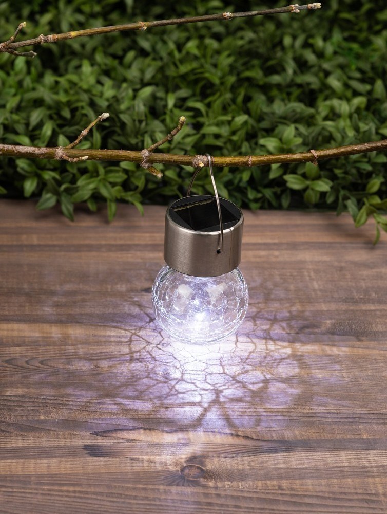 Подвесной светильник-ламочка с эффектом кракле ЭРА ERASF22-32 (арт. Б0053384). Диаметр светодиодного шара - 6 см. Металлическая ручка-подвес позволяет с комфортом применять данный уличный светильник. В дневное время садовый светильник подзаряжается естественным способом с помощью встроенной солнечной батареи, вечером автоматически включается, создаёт яркую дополнительную подсветку и красивый световой узор. Подвесная садовая LED-лампочка работает в любую погоду. Высокая защита от влаги и пыли - IP54. За счёт использования солнечной энергии для питания светильник ЭРА "Лампочка" можно размещать в любом уголке сада, перемещать с места на место.
