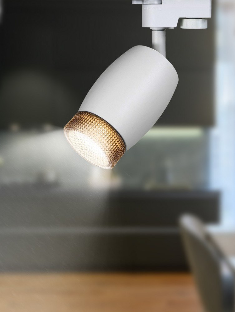 Однофазный трековый светильник под лампу с цоколем GU10. Светильник выполнен из алюминия и пластика. На передней части плафона находится пластиковое кольцо, стилизированное под хрусталь. Во включенном виде данное кольцо наполняется светом и создает превосходный визуальный эффект, а также оно выполняет функцию ограничителя угла рассеивания светового потока, снижая эффект ослепления светом.