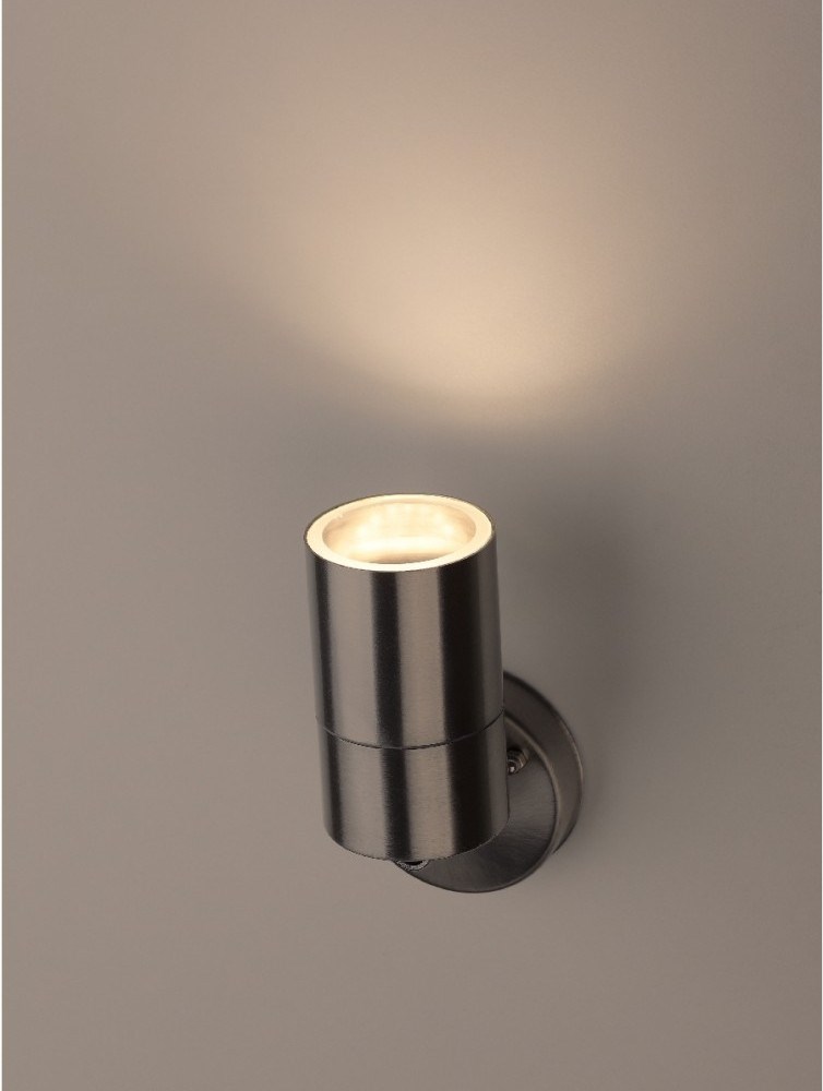 Светильник декоративный настенный WL14 создает интересные световые композиции, подчеркивает структуру материалов. Подходит для наружного уличного освещения. Цоколь для источника света GU10, напряжение питания 220В ~50/60Гц, материал нержавеющая сталь/стекло, цвет светильника хром, размер 77*180 мм, D60 мм, максимальная мощность лампы 50 Вт, степень защиты IP44