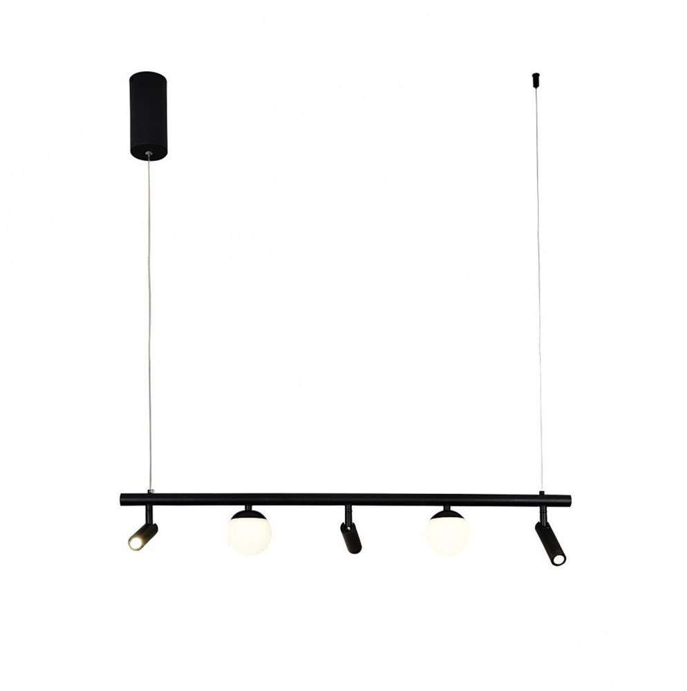 подвесная люстра, каркас черного цвета цилиндрической формы, в который вмонированы источники света двух типов - стационарные плафоны в форме шара,и поворотные споты, оснащены дистанционным пультом утравления.