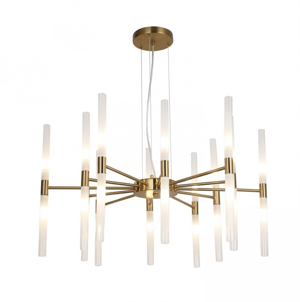 подвесная люстра, каркас из металла цвета латунь, сочетание коротких латунных трубок и стеклянных плафонов с матовыми белыми и прозрачными фрагментами, лампы G9 можно менять