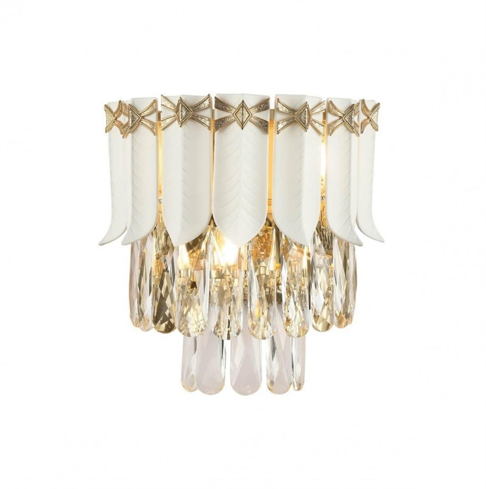 Каркас настенного светильника цвета золото, верхний ряд выполнен из керамических лепестков, которые покрыты белой глазурью и украшены золотым декором. Нижние слои выполнены из высококачественного хрусталя удлиненной формы оригинальной огранки. При укорачивании цепи люстра модифицируется в потолочный светильник