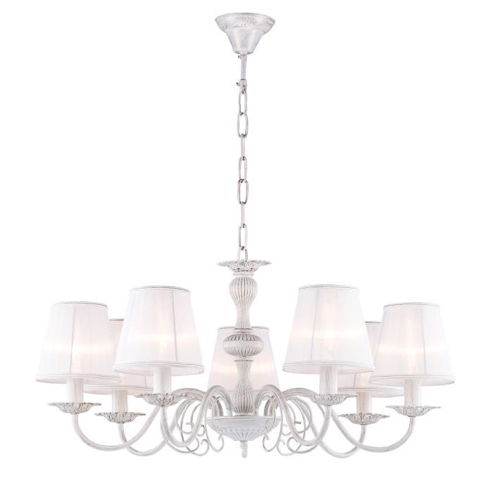 подвесная люстра; Крепление-крюк; Размер светильника-D710*H380/1410; Лампы-7*E14*40W, excluded; Цвет, отделка-каркас окрашен в белый цвет с золотой патиной, тканевый абажур из белой органзы украшен белой тесьмой