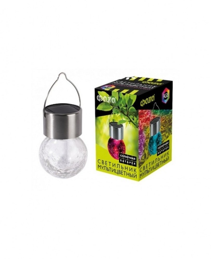Мультицветный светильник с солнечной батареей. Предназначен для декоративной подсветки комнат, террас, веранд на садовых и дачных участках. Можно использовать для декорации кустарников и деревьев. Колба отлита по технологии растрескавшегося стекла для создания бликов при свечении. Время непрерывной работы от полностью заряженного аккумулятора: 8 часов Время зарядки аккумулятора: 8 часов Автоматическое включение/выключение светильника при наступлении темного/светлого времени суток (фотосенсор).