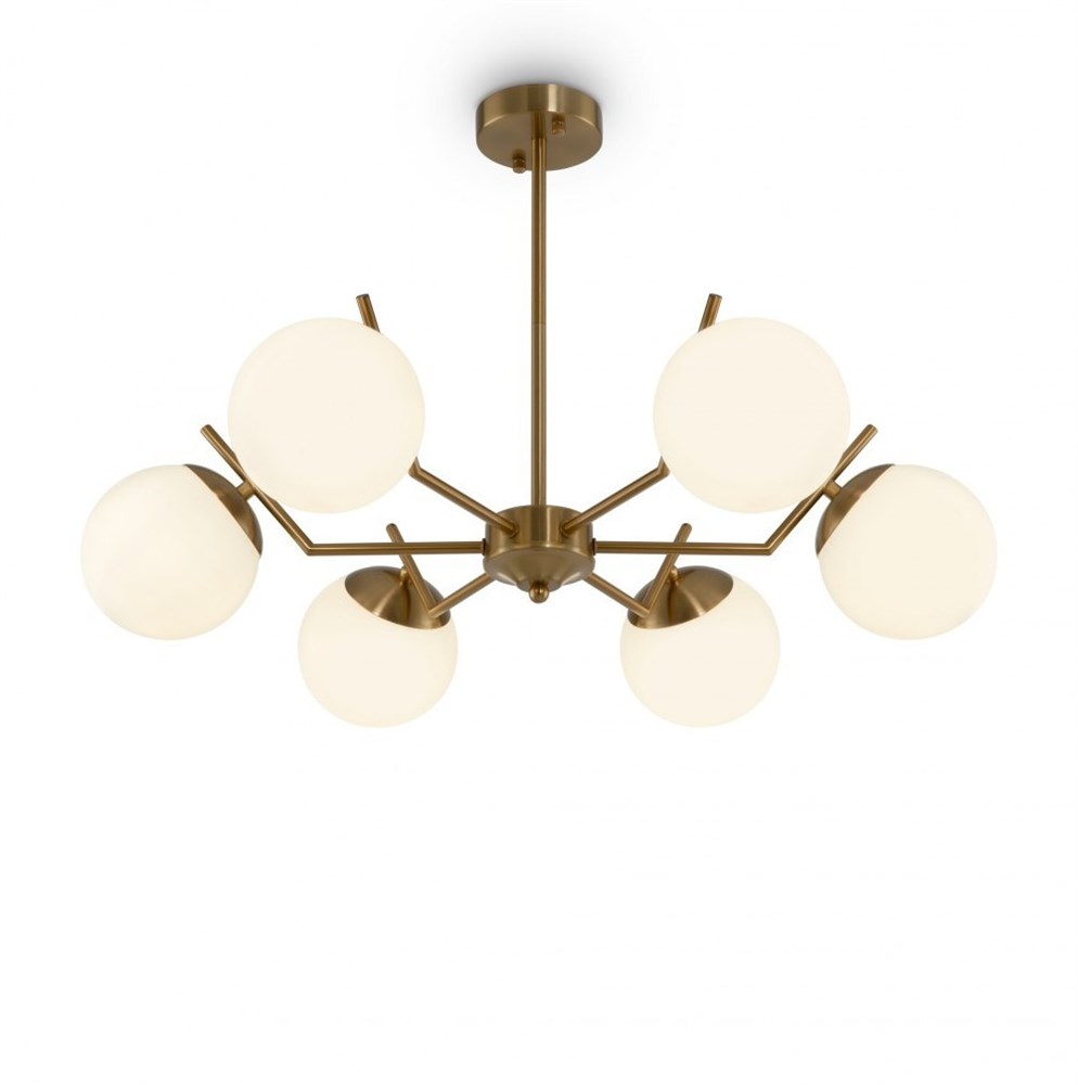 Обращение к природным формам наполняет современный дизайн глубоким смыслом. Визуальный образ – вдохновение для серии Moon – это лунный диск, символ изменчивости окружающего мира. Строгая геометрия металлической арматуры подчеркнута оттенком латуни. Стеклянные плафоны-сферы, окрашенные в матовый белый цвет, смотрятся легко и утонченно. Компактные потолочные модели подойдут для невысоких потолков. Серию составляют люстры, рассчитанные на 6 и 8 ламп. Они прекрасно интегрируются в пространство гостиной, спальни или кухни. Используйте их в интерьерах, выполненных в актуальных стилях: mid-century modern, сканди, минимализм.