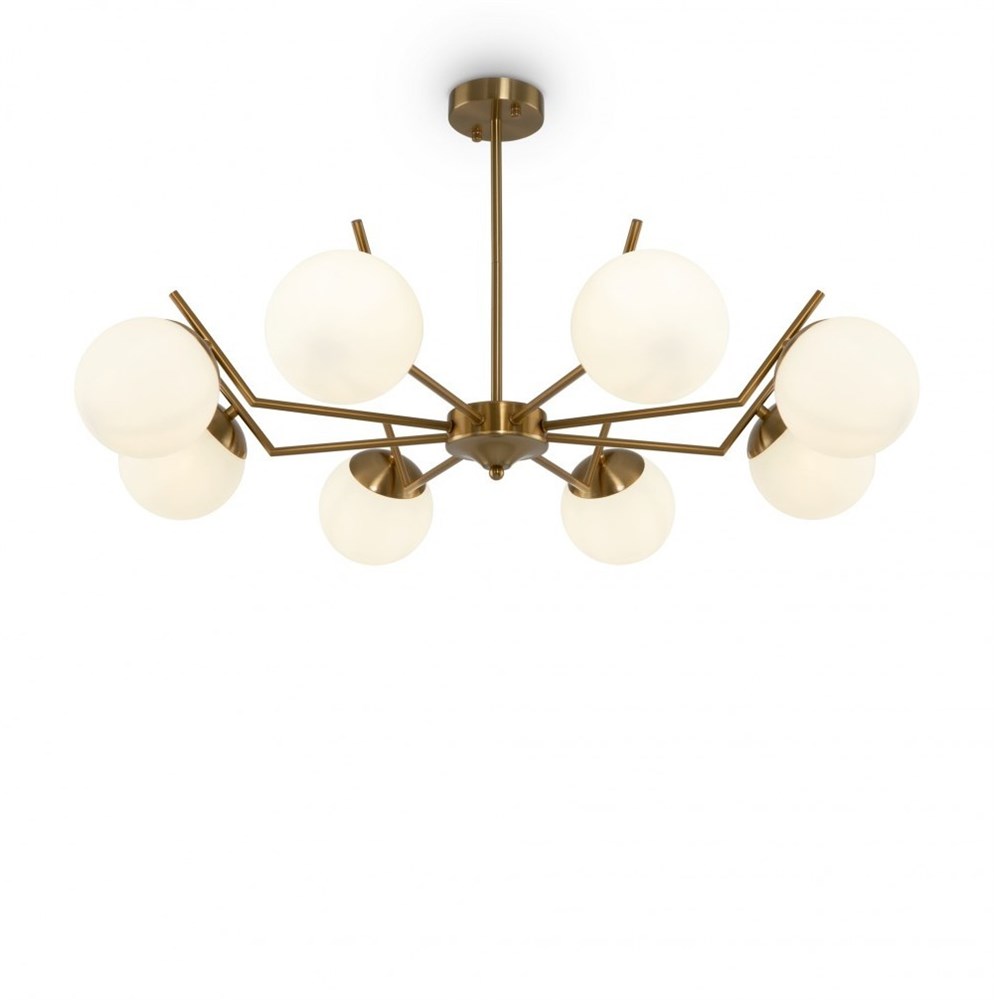 Обращение к природным формам наполняет современный дизайн глубоким смыслом. Визуальный образ – вдохновение для серии Moon – это лунный диск, символ изменчивости окружающего мира. Строгая геометрия металлической арматуры подчеркнута оттенком латуни. Стеклянные плафоны-сферы, окрашенные в матовый белый цвет, смотрятся легко и утонченно. Компактные потолочные модели подойдут для невысоких потолков. Серию составляют люстры, рассчитанные на 6 и 8 ламп. Они прекрасно интегрируются в пространство гостиной, спальни или кухни. Используйте их в интерьерах, выполненных в актуальных стилях: mid-century modern, сканди, минимализм.