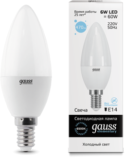 Gauss Лампа Elementary Свеча 6W 470lm 6500K Е14 LED 33136