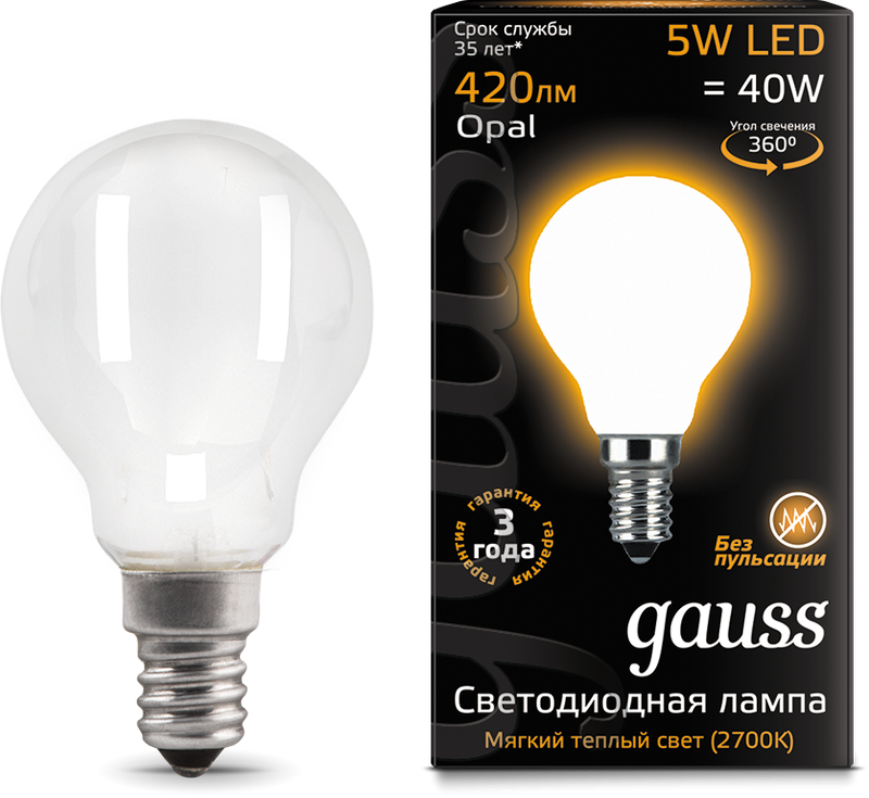 Gauss Лампа Filament Шар 5W 420lm 2700К Е14 milky LED 105201105