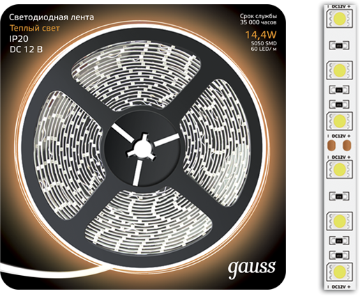 Gauss Лента LED 5050 -SMD 14.4W 12V DC теплый белый (блистер 5м) 312000114