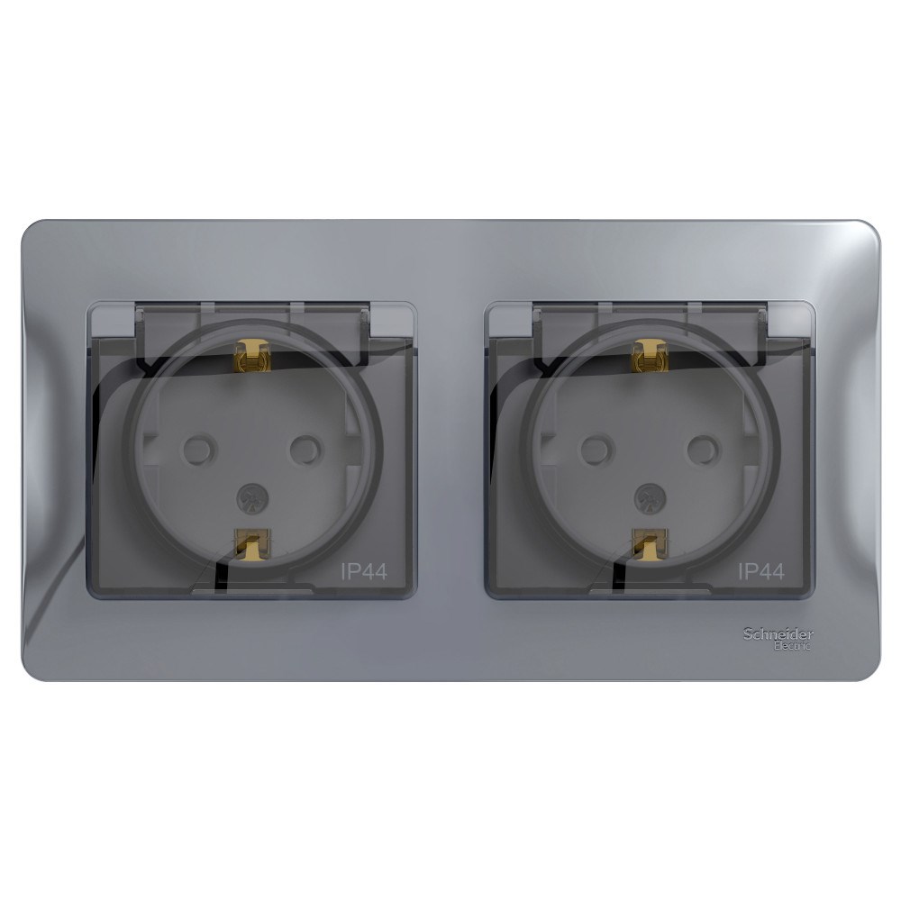 Розетка Systeme Electric (ранее Schneider Electric) серии Glossa (в сборе, цвет алюминий) двойная с заземлением, шторками и крышкой подходит для сетей 250 В, на ток 16 А. - Изделие со степенью защиты IP44 обеспечит безопасность использования в ванной и на кухне. - Заземляющий контакт обеспечивает дополнительную защиту от удара электрическим током. При наличии заземления электрический потенциал уходит в землю, защищая человека. - Выполнен из материала PС+ASA, стойкого к УФ-излучению и появлению царапин.