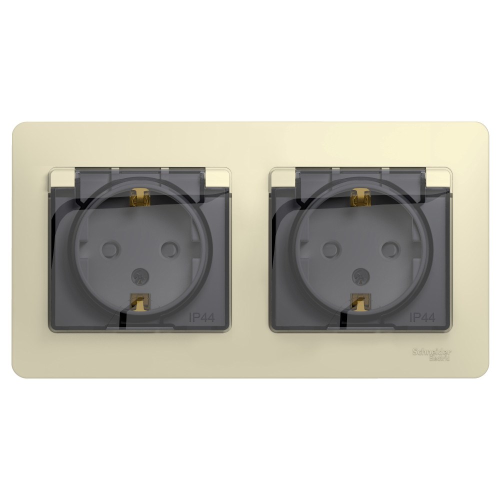 Розетка Systeme Electric (ранее Schneider Electric) серии Glossa (в сборе, цвет бежевый) двойная с заземлением, шторками и крышкой подходит для сетей 250 В, на ток 16 А. - Изделие со степенью защиты IP44 обеспечит безопасность использования в ванной и на кухне. - Заземляющий контакт обеспечивает дополнительную защиту от удара электрическим током. При наличии заземления электрический потенциал уходит в землю, защищая человека. - Выполнен из материала PС+ASA, стойкого к УФ-излучению и появлению царапин.