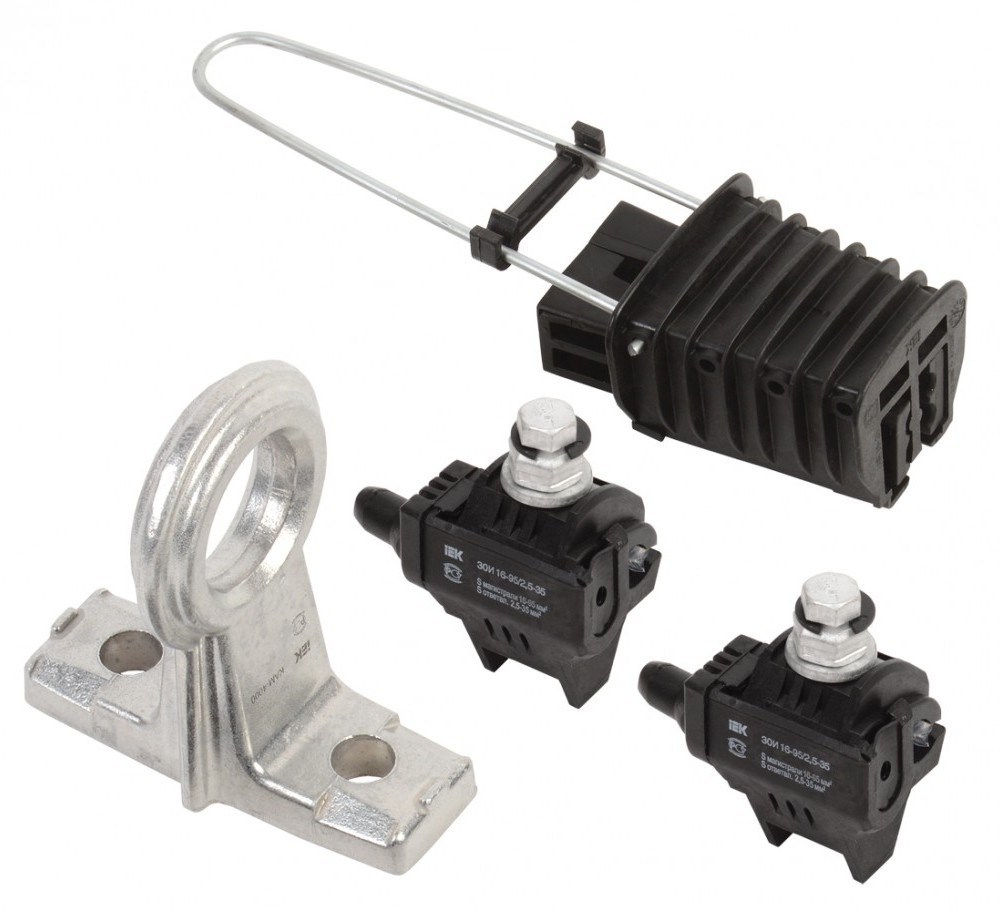 Комплект фасадного крепления типа КФК предназначен для промежуточного крепления и стяжки в пучок самонесущих изолированных проводов (СИП), напряжением до 1 кВ, на опорах и стенах зданий. Корпус изготовлен из полимера, устойчивого к ультрафиолетовому излучению и погодно-климатическим факторам. Дюбельная часть арматуры устанавливается в отверстие 012 мм, фиксируется гвоздем. Комплект КФК имеет специальный паз, позволяющий осуществить прокладку второй линии вдоль имеющейся трассы с помощью хомутов ХС. Комплект крепления к столбу КС-4 ИЭК включает в себя: 1) КАМ-4000 - 1 шт. 2) ЗОИ 16-95/2,5-35 - 2 шт. 3) ЗАБ 16-25 - 1 шт.