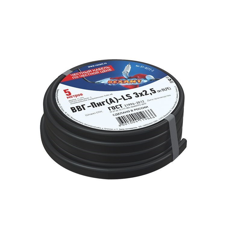 Кабель силовой медный ВВГ-Пнг(А)-LS 3x2,5 мм², длина 5 метров, ГОСТ 31996-2012, ТУ 16.К71-310-2001 Rexant 01-8272-5