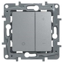 Клавишный светорегуляторEtika для скрытого монтажа, цвет алюминий. Позволяет регулировать яркость ламп. Экономит электроэнергию. Благодаря функции плавного включения существенно продлевает срок службы ламп. Встроенная память позволяет одним нажатием выводить яркость на комфортный уровень. Предусмотрен режим с фиксированными уровнями яркости (33-66-100%). Электронная защита от перегрузки и короткого замыкания. Особенности:- Светорегулятор универсальный.Подходит для управления лампами:Накаливания и галогенными в диапазоне 3-400Вт;Диммируемыми светодиодными в диапазоне: 3-75 Вт (не более 10 шт.)- Плавное включение и выключение;- Запоминание последнего уровня яркости;- Режим с фиксированными уровнями яркости (33-66-100%);- Режим плавного отключения в течение часа;- Защита от перегрузки и короткого замыкания.- Двухпроводное подключение (в разрыв фазного проводника). - Устанавливается в стандартную монтажную коробку.- Комплектуется инструкцией.- Возможно внешнее управление (линия до 50 метров), кнопками без подсветки с Н/О контактом.Особенности серии Etika:- Корпус механизма- высококачественный поликарбонат, не проводит электрический ток, не поддерживает горение. - Специальный профиль внешнего контура механизма обеспечивает простоту и безошибочность многопостового монтажа. - Острые крепёжные лапки с широким углом раскрытия, обеспечивают надёжную фиксацию в монтажной коробке.