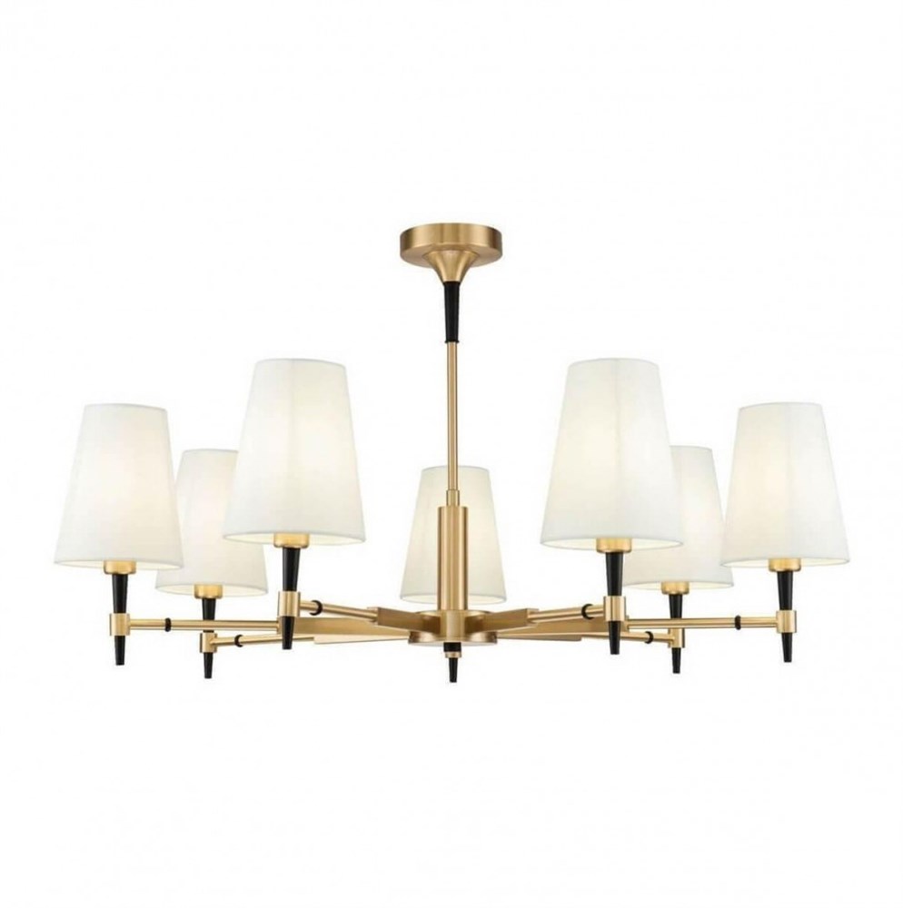 Черты модерна и элементы классики сочетаются в дизайне светильников серии Zaragoza. Арматура изготовлена из металла. Большая ее часть покрыта гальваническим способом в цвет латуни. Небольшие детали в основании и на рожках покрашены в черный цвет. Такое сочетание цветов придает светильникам элегантности. Абажуры сделаны из белой ткани, нанесенной на ПВХ. Люстра H001CL-07BS; Цвет-Латунь; Высота-490; Высота при подвесном креплении--; Диаметр-880; Ширина--; Глубина--; Цоколь-E14; Мощность-40W