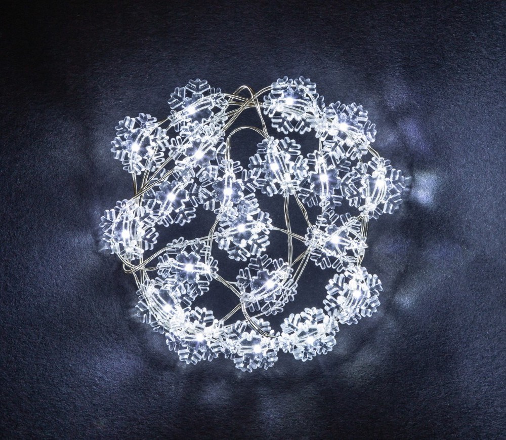 тип гирлянды - фигурки белые снежинки ; материал фигурки - ПВХ; цвет свечения - белый; режим постоянного свечения; питание - 2 АА (в комплект не входят); общая длина - 2,3 м; длина провода до первого светодиода - 0,3 м; количество светодиодов - 20 шт; расстояние между фигурками - 10 см; тип провода - медный провод; степень защиты - IP20; температура эксплуатации от - 20 до +40°С; срок службы - 50000 часов; гарантия -12 месяцев.