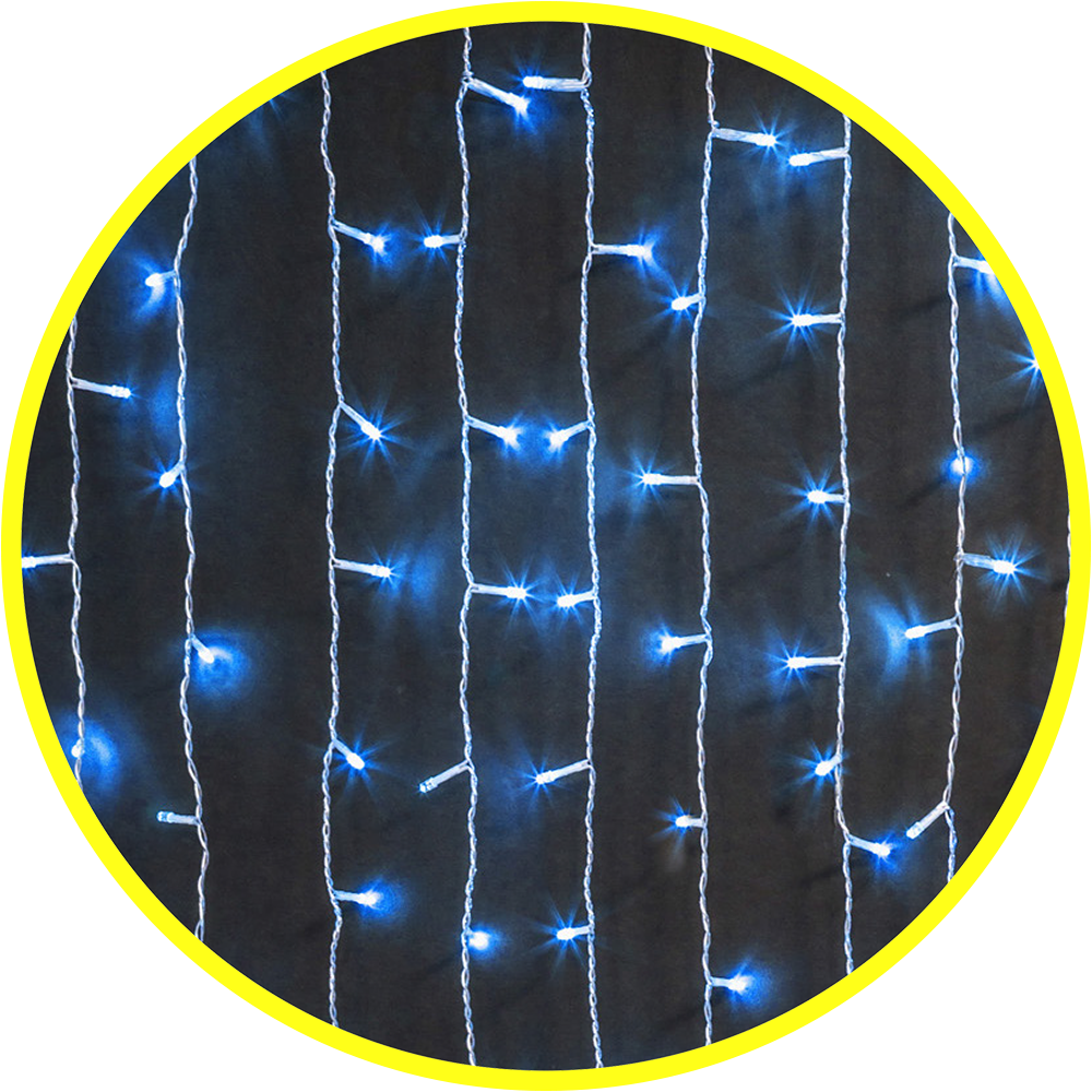 тип гирлянды - занавес ; цвет свечения - синий; режим постоянного свечения; размер - 1,5х1,2 м; длина провода до первого светодиода - 1,5 м; количество светодиодов - 192 шт; расстояние между светодиодами - 10 см; расстояние между нитями - 10 см; соединение в линию до 6 гирлянд; тип провода - прозрачный ПВХ; степень защиты - IP20; температура эксплуатации от -20 до +40°С; срок службы - 50000 часов; гарантия - 12 месяцев.