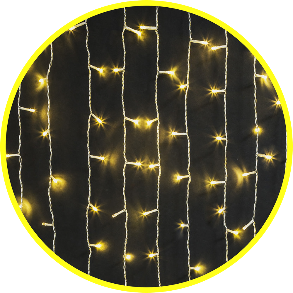 тип гирлянды - занавес цвет свечения - тёплый белый; режим искрящийся снег ; размер - 2,0х1,5 м; длина провода до первого светодиода - 1,5 м; количество светодиодов - 357 шт; расстояние между светодиодами - 8 см; расстояние между нитями - 10 см; соединение в линию до 5 гирлянд; тип провода - прозрачный морозостойкий ПВХ; степень защиты - IP44; температура эксплуатации от -40 до +40°С; срок службы - 50000 часов; гарантия - 12 месяцев.
