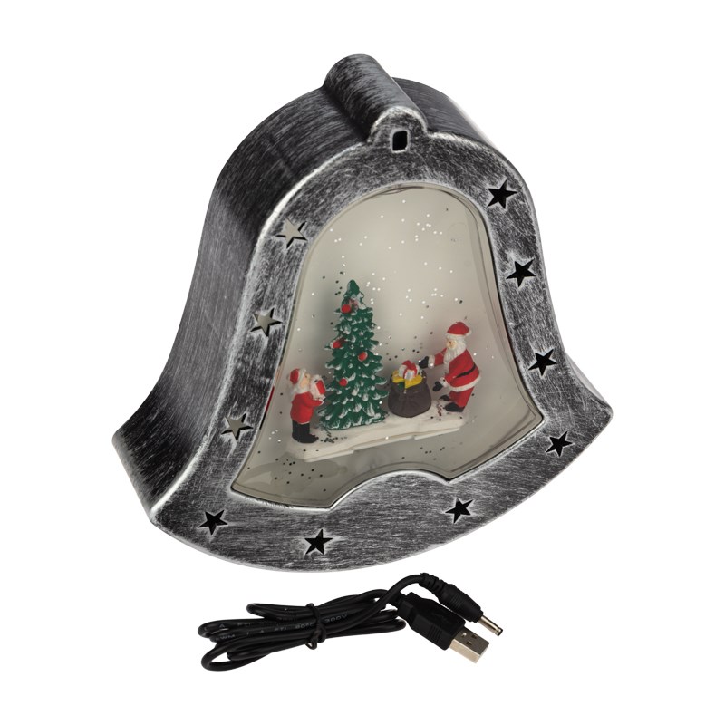 Декоративный светильник "Колокольчик" - необычное интерьерное украшение, которое создано, чтобы подчеркнуть уникальный стиль интерьера и внести атмосферу уюта в ваш дом. 4 диода излучают белый свет нейтрального оттенка и эффектно подсвечивают композицию из фигур, расположенную в центре прозрачной колбы. Виxрь сверкающего конфетти имитирует снегопад, приковывает внимание окружающиx и создает праздничное настроение. Фонарь в виде колокольчика питается от 3 батареек типа АА, что дает возможность разместить его в любом удобном месте, где розетка недоступна. USB-кабель вxодит в комплект.
