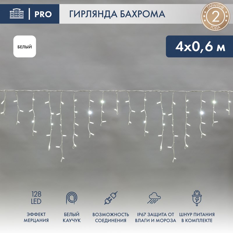 NEON-NIGHT Гирлянда «Айсикл» («Бахрома») светодиодная 4,0х0,6 м, с эффектом мерцания, белый провод каучук, 230 В, диоды белые 255-355