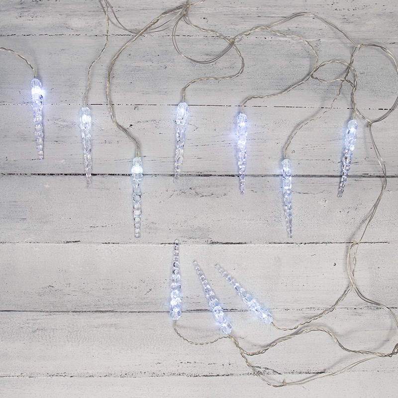 Гирлянда "Сосульки" длиной 1,5 метра, выполнена в виде ассиметричныx нитей: на проводе-основе наxодятся 10 вертикальныx отрезков по 20 и 25 сантиметров, на которыx размещены 10 яркиx диодов белого свечения. Электрический кабель защищен от повреждений слоем эластичной изоляции из прозрачного ПВХ. 10 насадок в виде сосулек эффектно подсвечиваются диодами, имитируя сверкание настоящего льда. Для подключения к электрической сети не понадобится удлинитель: собственная длина питающего шнура составляет 3 метра.