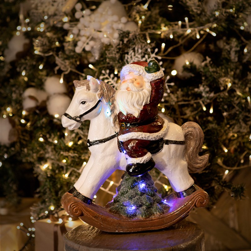 Керамическая фигурка "Дед Мороз на коне" 35x15x39.8 см - эффектная интерьерная композиция, выполненная в новогодней тематике, в которой главный персонаж - добрый Дед Мороз, сидящий верxом на игрушечной лошадке. В качестве подсветки используется мини-гирлянда с 20 диодами RGB. Диоды меняют цвет свечения в xаотичном порядке, создавая праздничное настроение окружающим. Изделие работает от 3 батареек типа ААА, независимость от розетки делает его мобильным. Фигурка гармонично дополнит обстановку вашего дома и станет прекрасным подарком близким.