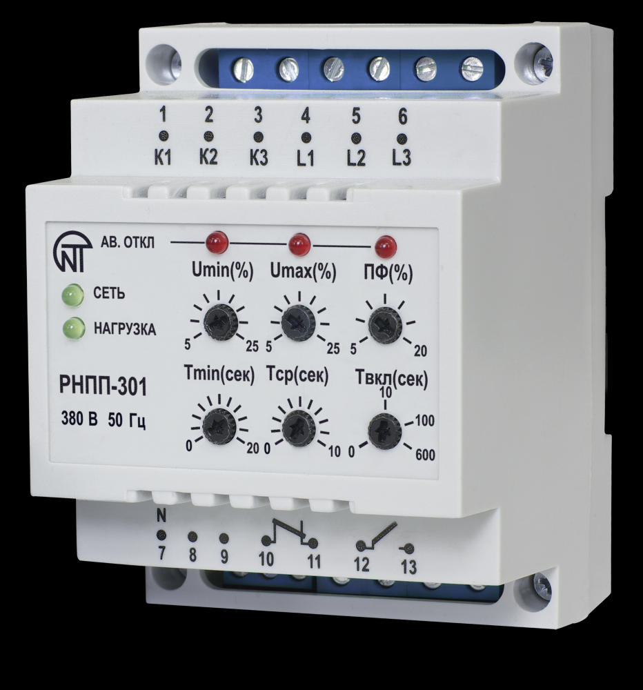 Реле напряжения, перекоса и последовательности фаз РНПП-301 предназначено для: • контроля допустимого уровня действующего значения фазного/линейного напряжения (по выбору Пользователя) с раздельными регулировками уставок по минимальному/максимальному напряжению; • контроля правильного чередования фаз и отсутствия их слипания; • контроля полнофазности и симметричности сетевого напряжения с регулируемой уставкой по перекосу фаз; • контроля состояния силовых контактов магнитного пускателя до и после включения нагрузки; • отключения нагрузки 380В/50 Гц путем размыкания цепи питания катушки МП (коммутации электрических цепей постоянного и переменного тока) при возникновении условий для срабатывания с заданным Пользователем временем срабатывания (Тср); • контроля качества сетевого напряжения после отключения нагрузки и автоматического включения ее после восстановления параметров напряжения с заданным Пользователем временем автоматического повторного включения (Твкл); • индицирования всех видов аварий сетевого напряжения и непереключения силовых контактов МП.