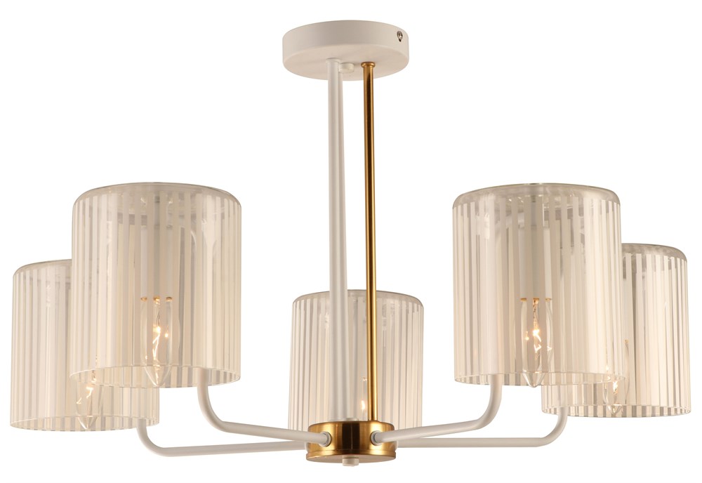 5-рожковая люстра на двух штангах – белого и золотого цветов. Плафоны люстры на потолок Rivoli Evonne (арт. 2088-305) изготовлены из стекла с чередованием прозрачных и матовых участков. Дизайнерскую коллекцию Evonne в классическом стиле дополняют люстры 7-рожковые (арт. 2088-307) и настенное бра (арт. 2088-401). Люстра Evonne c 5 стеклянными плафонами качественно освещает до 15 м2 площади жилого пространства. Эту модель стоит купить в качестве основной люстры в гостиную, люстры в спальню. Такая дизайнерская люстра даст много света и поможет создать неповторимый интерьер. Источники света для данной люстры – Е14 40 Вт (5 ламп).