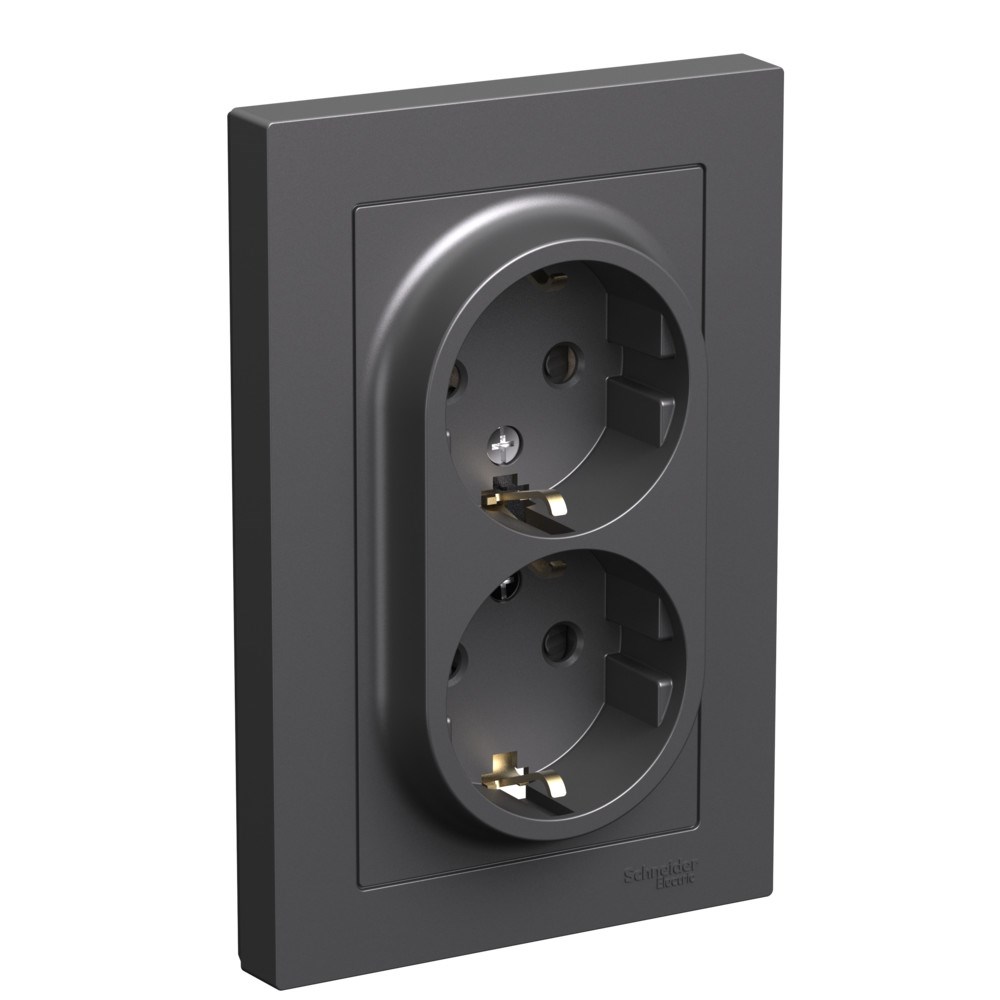 Розетка двойная Systeme Electric (ранее Schneider Electric) серии AtlasDesign (в сборе, цвет БАЗАЛЬТ) с заземлением и шторками подходит для сетей 250 В, на ток 16 А. - Заземляющий контакт обеспечивает дополнительную защиту от удара электрическим током. - Лицевые детали из качественного ABS-пластика, устойчивого к царапинам и УФ-излучению. - Двойная розетка позволяет подключить два устройства в одном месте. - Изделие поставляется в комплекте с рамкой того же цвета.