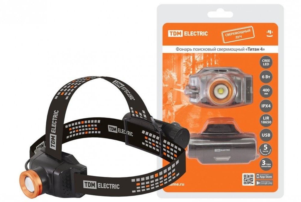 TDM Фонарь «Титан 4» налобный, 6 Вт 1 светодиод CREE 400 лм, 1х18650 3.7 В 2200 мА*ч, IPX4, USB, SQ0350-0064