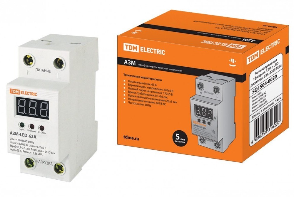 TDM Реле напряжения 1ф АЗМ-LED с LED-дисплеем 63А-230В SQ1504-0020