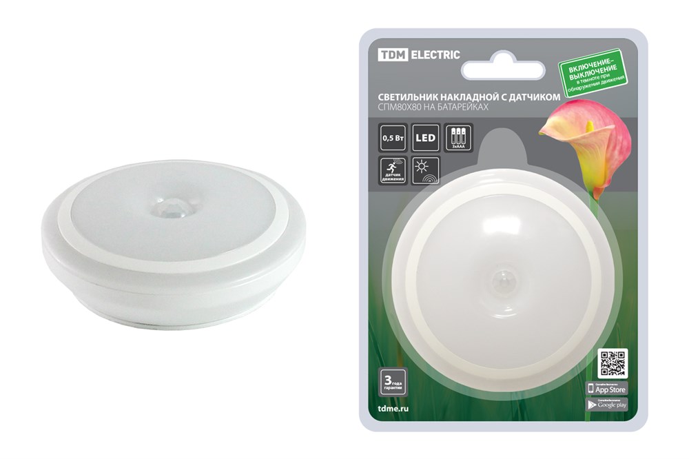 TDM Светильник накладной светодиодный 80х80 0,5 Вт, 3хААА, дат. движ. и освещ. SQ0329-3614