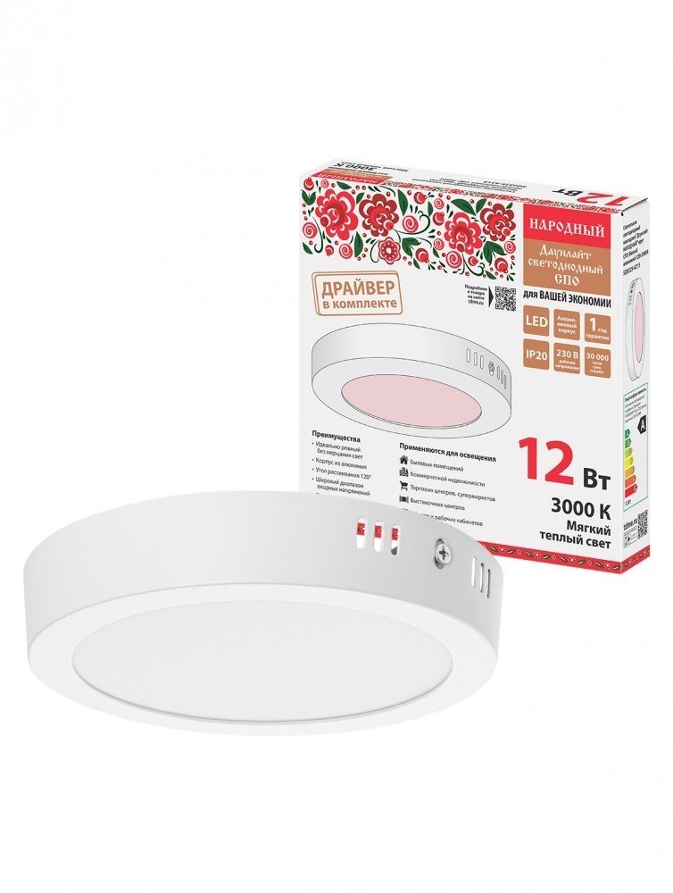 TDM Светильник светодиодный накладной "Даунлайт НАРОДНЫЙ" круг СПО (белый) алюминий 12Вт 3000К SQ0329-4215