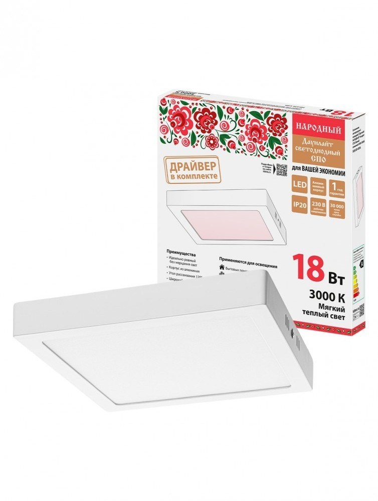 TDM Светильник светодиодный накладной "Даунлайт НАРОДНЫЙ" квадрат СПО (белый) алюминий 18Вт 3000К SQ0329-4206