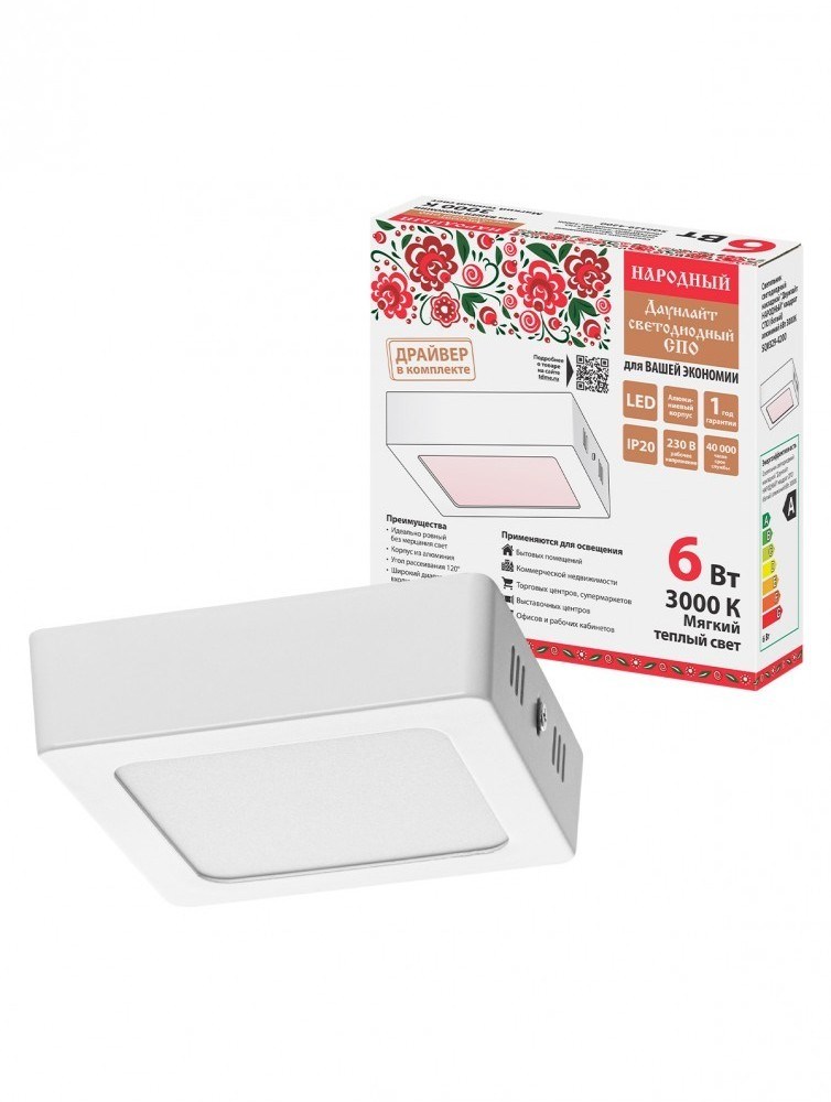 TDM Светильник светодиодный накладной "Даунлайт НАРОДНЫЙ" квадрат СПО (белый) алюминий 6Вт 3000К SQ0329-4200