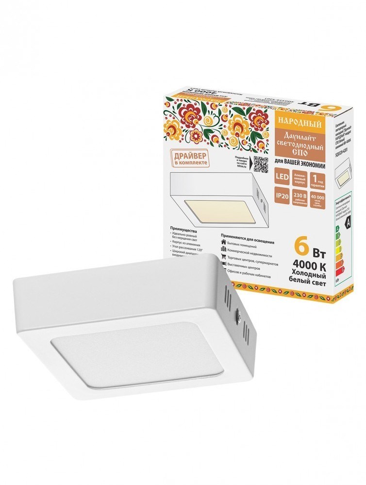 TDM Светильник светодиодный накладной "Даунлайт НАРОДНЫЙ" квадрат СПО (белый) алюминий 6Вт 4000К SQ0329-4201
