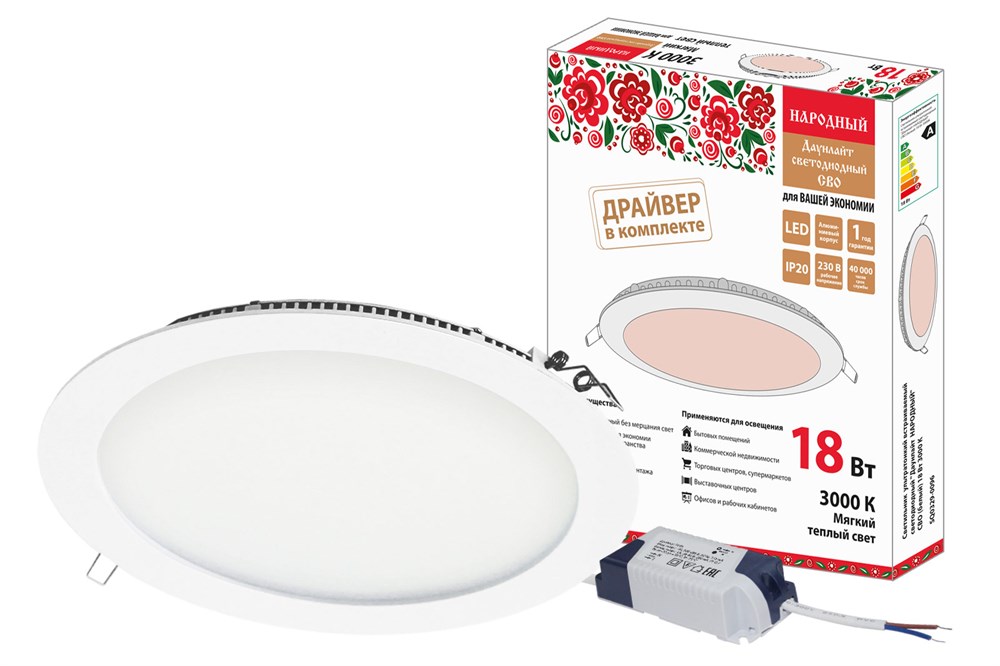 TDM Светильник ультратонкий встраиваемый светодиодный "Даунлайт НАРОДНЫЙ" СВО (белый) 18 Вт 3000К SQ0329-0096