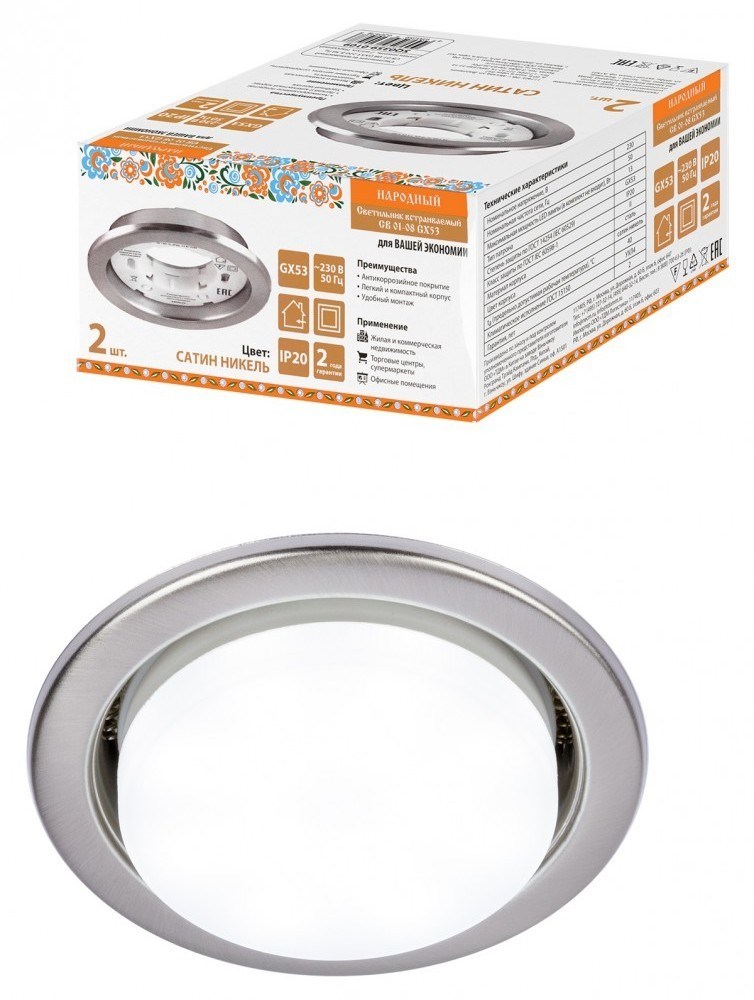 TDM Светильник встраиваемый СВ 01-08 GX53 220 В 50 Гц, сатин никель, 2 шт/уп, Народный SQ0359-0109