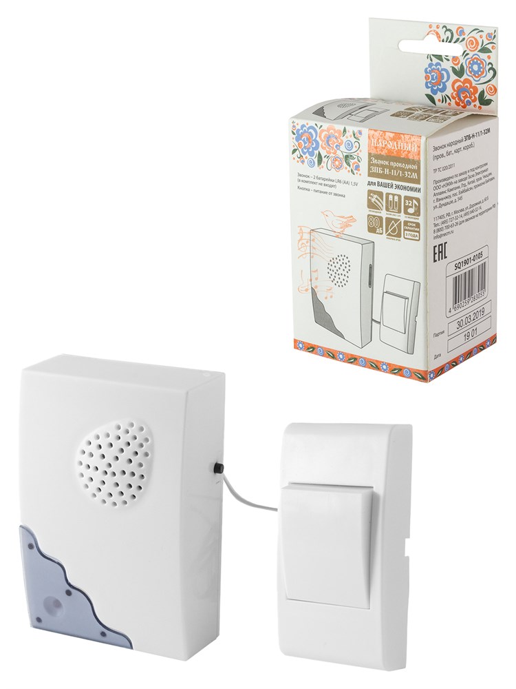 TDM Звонок проводной на батарейках "народный" ЗПБ-Н-11/1-32М (32 мелодии, кнопка IP30, 2х1,5В АА) SQ1901-0105