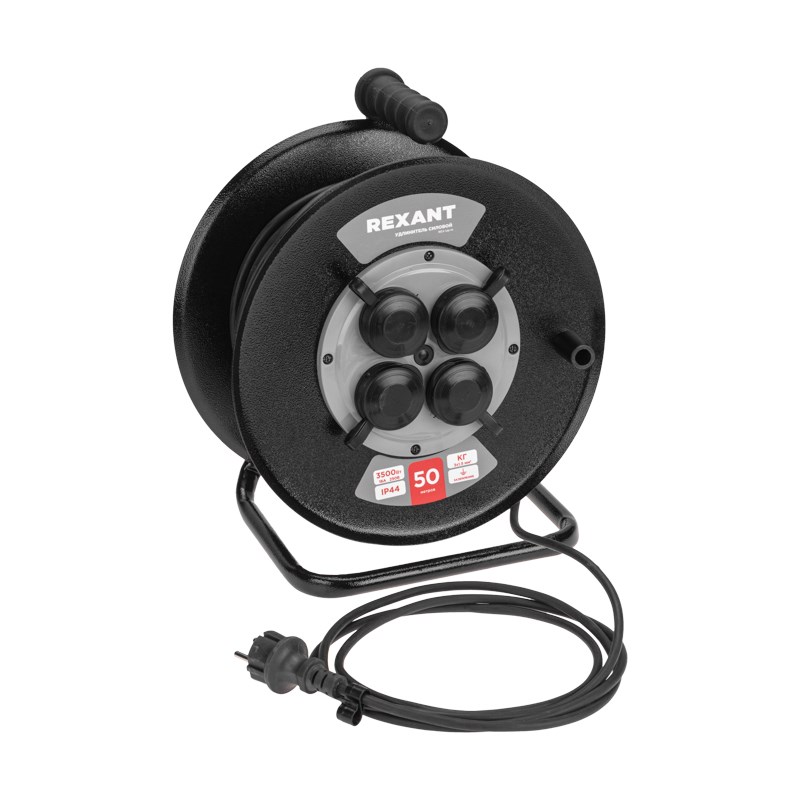 Удлинитель силовой КГ на катушке 4 гнезда, с/з, 50м, 3х1,5мм², IP44 c защитными крышками, металлическая катушка REXANT 13-5013